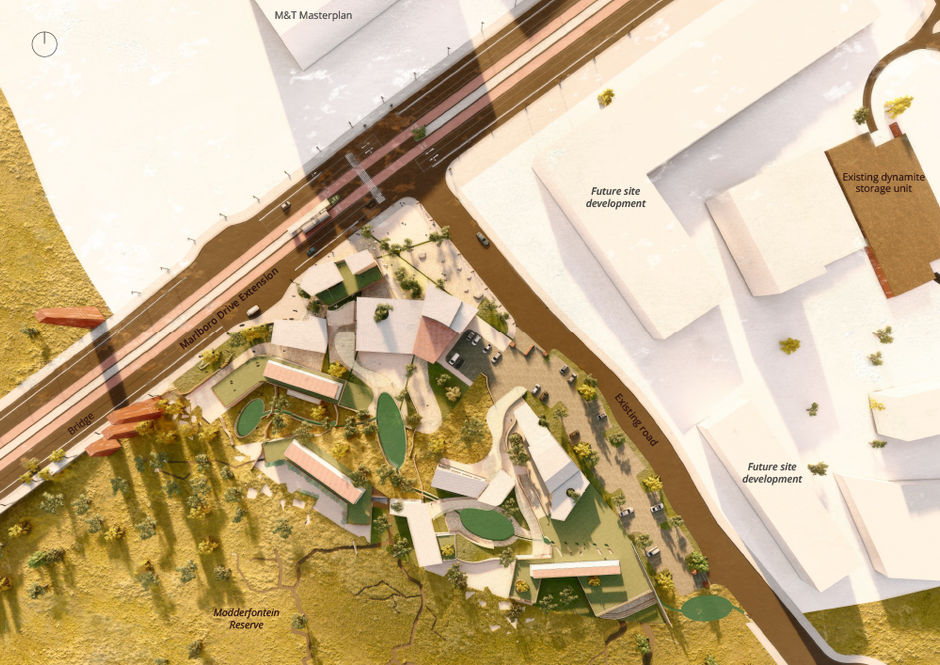 Modderfontein, like someone recovering from drug addiction, requires rehabilitation. These problems must be decomposed (dissected) to re-compose (rehabilitate) them. This project explores rehabilitation of the problems on three main scales and suggests ways of re-composing (rehabilitating) them through architectural conceptual drivers. The first driver is Kintsugi: a practice of re-composing what is broken (decomposed) by celebrating or highlighting the rehabilitation process. A second conceptual driver is chromatography which also deals with themes of decomposition and re-composition. The first and largest scale that requires rehabilitation is the fragmentation of communities surrounding Modderfontein. This segregation arose because of Apartheid planning and until today still requires the facilitation of a welcoming meeting point. Secondly, Modderfontein’s land has experienced damage through chemical dynamite explosions, identity-stripping alien trees and chemicals in its dams. The building uses rehabilitative indigenous landscaping and purifying water systems. Thirdly, on the smallest scale, the drug addict requires rehabilitation through the building’s programme. The programme is divided into three parts where firstly, earning is carried out through retail spaces. Secondly, destigmatising education facilities teach surrounding communities about drug use and rehabilitation awareness. The third area is healing which includes conventional inpatient and outpatient facilities, as well as a harm-reducing overdose prevention site (OPS) where addicts can use substances under professional observation.