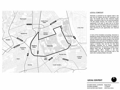 The Urban Analysis of Cities in the Global South is intended to develop skills in reading and understanding cities through representations of urban form. The project forms part of the course requirements for History and Theory of Urban Design in the Masters of Urban Design Degree Programme at the School of Architecture and Planning, University of the Witwatersrand. Experts in the field of urban design have developed a range of deductive, comparative, correlational, evidence-based and experiential mapping techniques to capture dimensions of urban reality. Students studied analytical techniques from The Concise Townscape (Cullen, 1960), The Image of the City (Lynch, 1960), History of Urban Form (Morris, 1972), Responsive Environments (Bentley, 1985), Great Street (Jacobs, 1995), The Boulevard Book (Jacobs, 2003), Anatomy of the City (Bachelor, 2002), Understanding City Form and Design (Bosselman, 2008), and Africa Drawn (White, Pienaar & Serfontein, 2015). Through these techniques, time (history), morphology, movement patterns, infrastructure, human and natural features, and other place-making characteristics can be shown graphically. This allows for an understanding of the complexity and systemic nature of the city to be unpacked across various scales.
